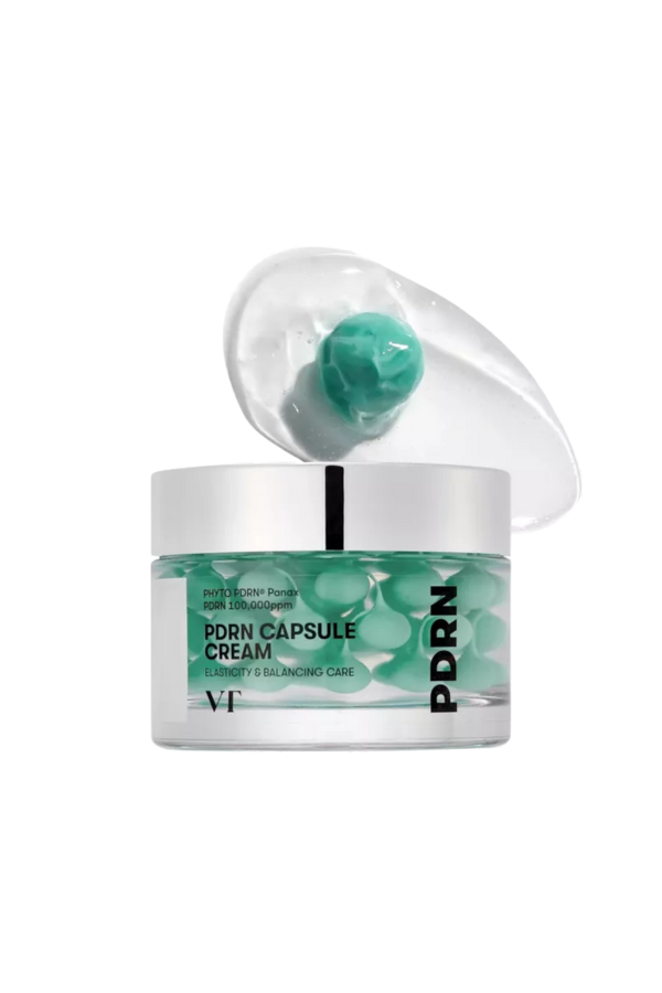 The VT PDRN Capsule Cream 100 is an intensive rejuvenating cream formulated with PDRN (Polydeoxyribonucleotide) encapsulated in tiny micro-capsules that burst upon application.